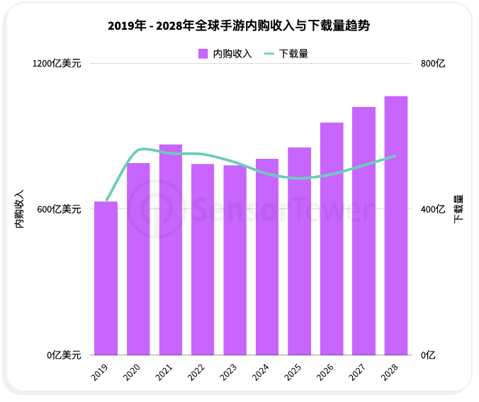 据Sensor Tower最新报告显示,全球移动与PC游戏市场正重拾增长势头,合计市场规模预计将在2028年突破1200亿美元。2024年全球移动游戏内购收入同比增长4%,已超过2020年水平。2025年将继续增长6%,达到854亿美元。预计2028年全球移动游戏内购收入达到1065亿美元。