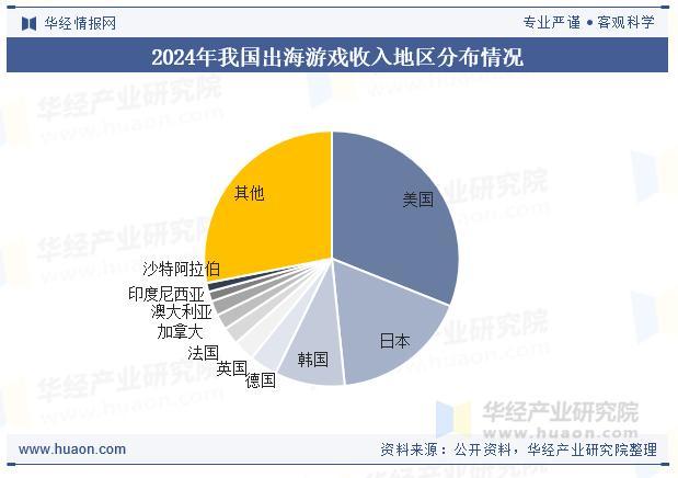 2024年,我国出海游戏收入占比前五的国家是美国、日本、韩国、德国和英国。其中,美、日、韩三国市场位列前三,分别达到31.06%、17.32%和8.89%。同时,中国对其他市场的拓展持续强化,取得一定成效,例如沙特已进入中国出海收入TOP10地区。